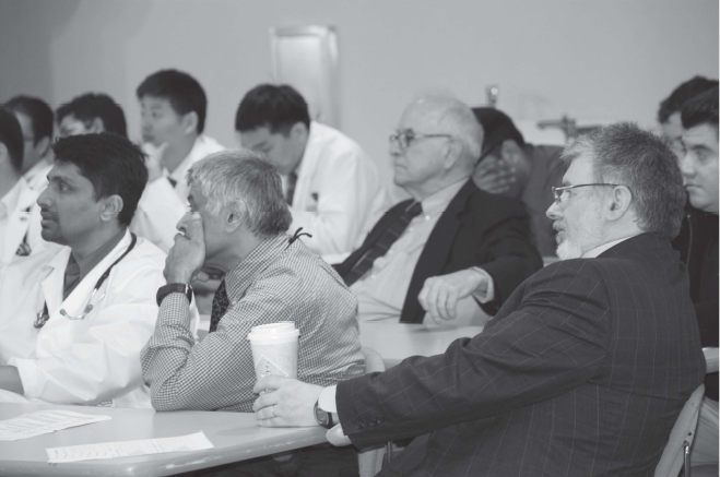 From left: Dr. Deepak Malhotra, Dr. Peter White and Dr. Joseph Shapiro, Chair, Dept. of Medicine along with Internal Medicine Residents and Fellows in a Curriculum Session