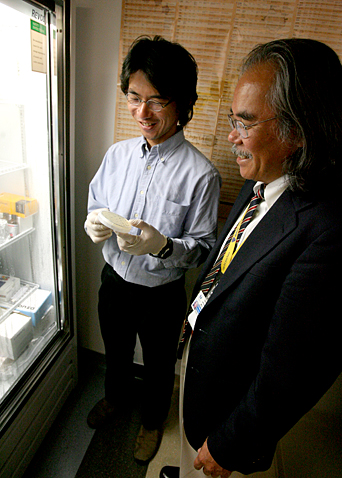 Dr. Hironori Matsushima, left, and Dr. Akira Takashima look at a culture dish to see if the antimicrobial proteins can kill bacteria. The researchers plan to incorporate those proteins into a powdered milk that would help solve the problem of chronic diarrhea in children of developing countries. |