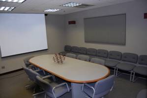 conference table, dry-erase white board, projector and screen. The room is equipped