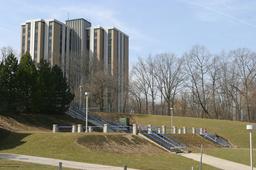 Parks Tower was the University's first large-scale dormitory and although sometimes it appears that Parks Tower is taller than the Bell Tower, it is not. While the Bell Tower is 191'5/8" tall and Parks Tower measures 198'7", the Bell Tower is on a elevation of 621' while Parks Tower is on an elevation of 594'6". What all this means is the Bell Tower does in fact clear Parks Tower by 34'6".Video Tour
