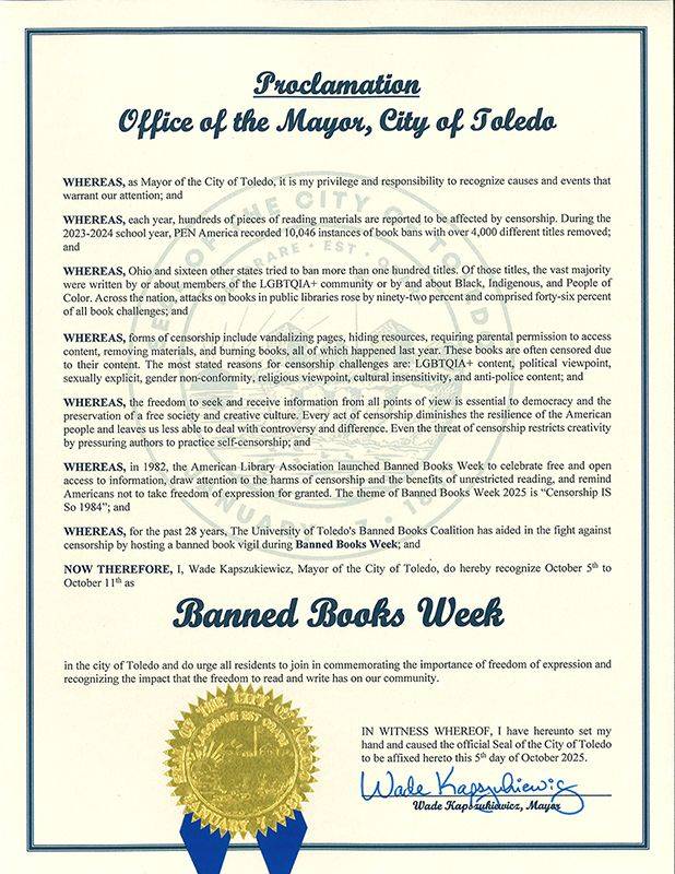 - "Banned Books Week" Proclamation, Office of the Mayor, City of Toledo, October 5, 2025