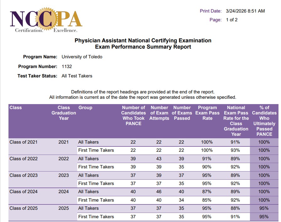 The purpose of the UToledo Physician Assistant Program is to graduate competent professionals who are well-prepared for the demands of professional practice in a rapidly changing healthcare environment. The curriculum goals were developed based on the Accreditation Review Commission on Education for the Physician Assistants (ARCPA) Standards, the UToledo PA Program Competencies, Program Learning Outcomes, Mission Statement, and the needs of the PA profession. Knowledge, skills, and professional behaviors are essential elements of professional practice.